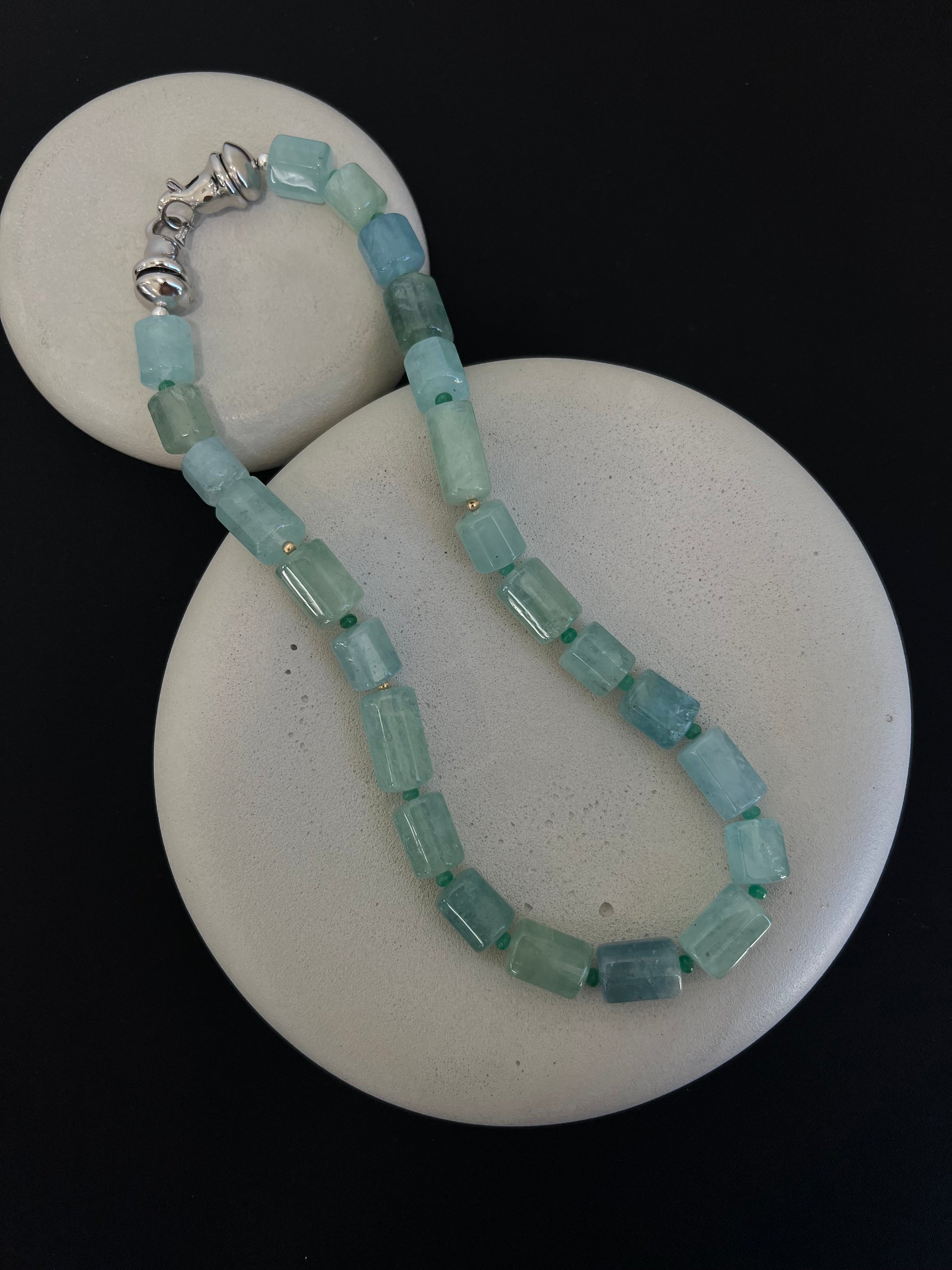 Blue and green natural aquamarine with emerald and gold bead details that can be worn in two ways- with the clasp in the front with charms or to the back, allowing the beads to take center stage.