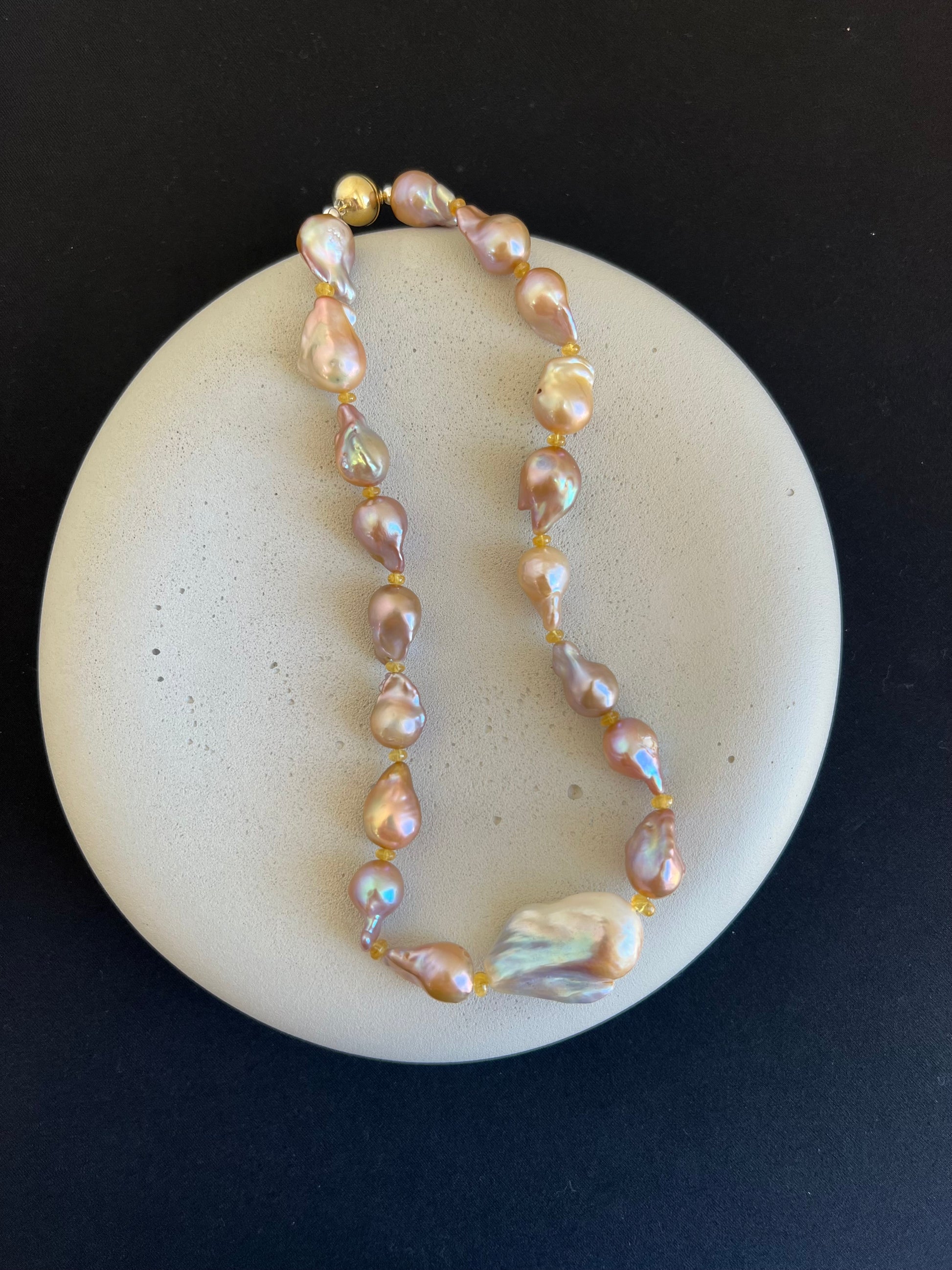 Blushing pearls with pink and gold luster and glowing opal accents.