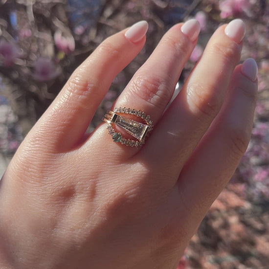 Vintage one-of-a-kind elongated tapered baguette diamond engagement ring set in 18kt yellow gold. White diamond nesting bands with heirloom square diamonds and a teal sapphire all set in 18kt yellow gold. The bands can be interchanged and stacked differently with the engagement ring for different looks!