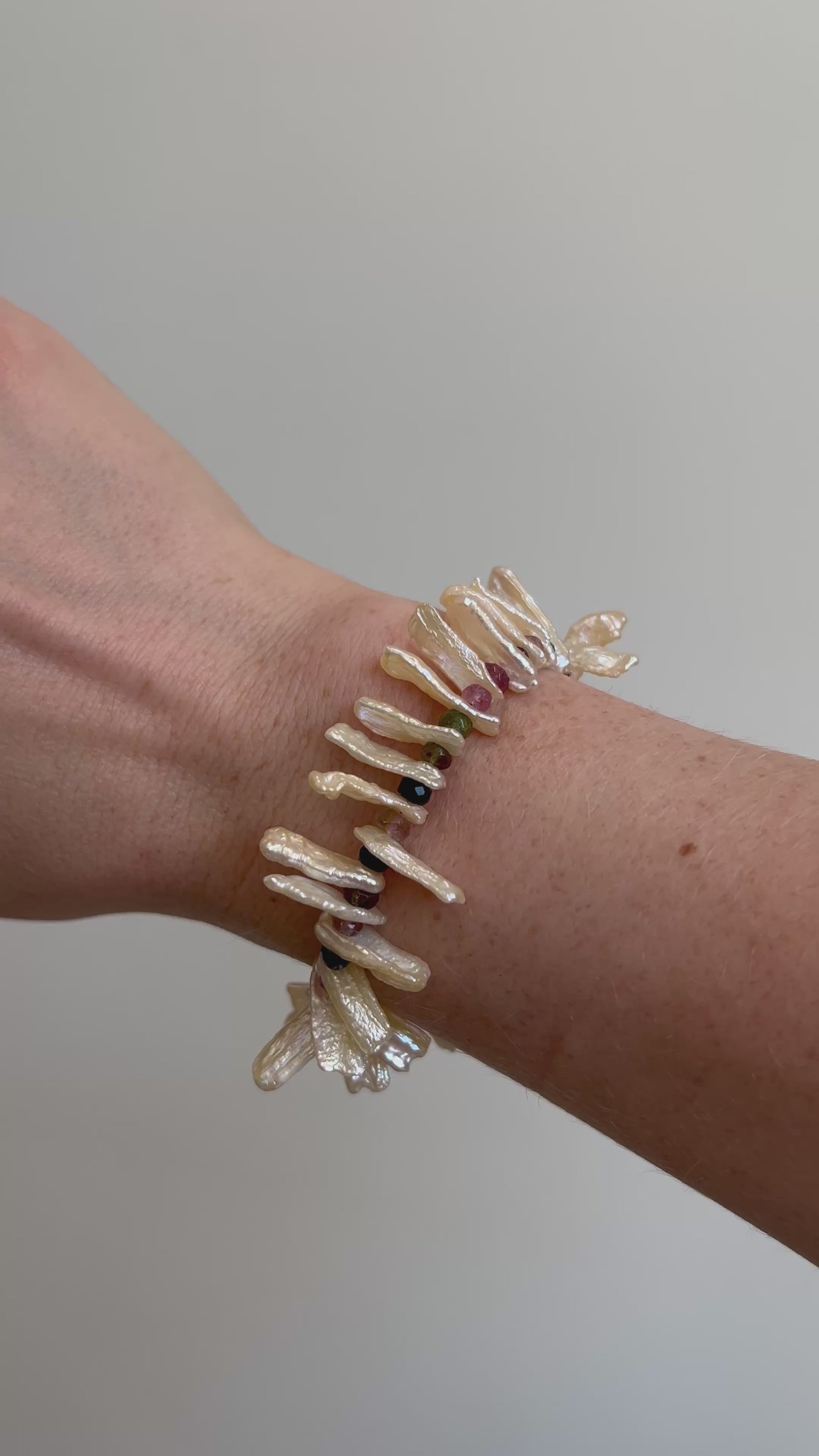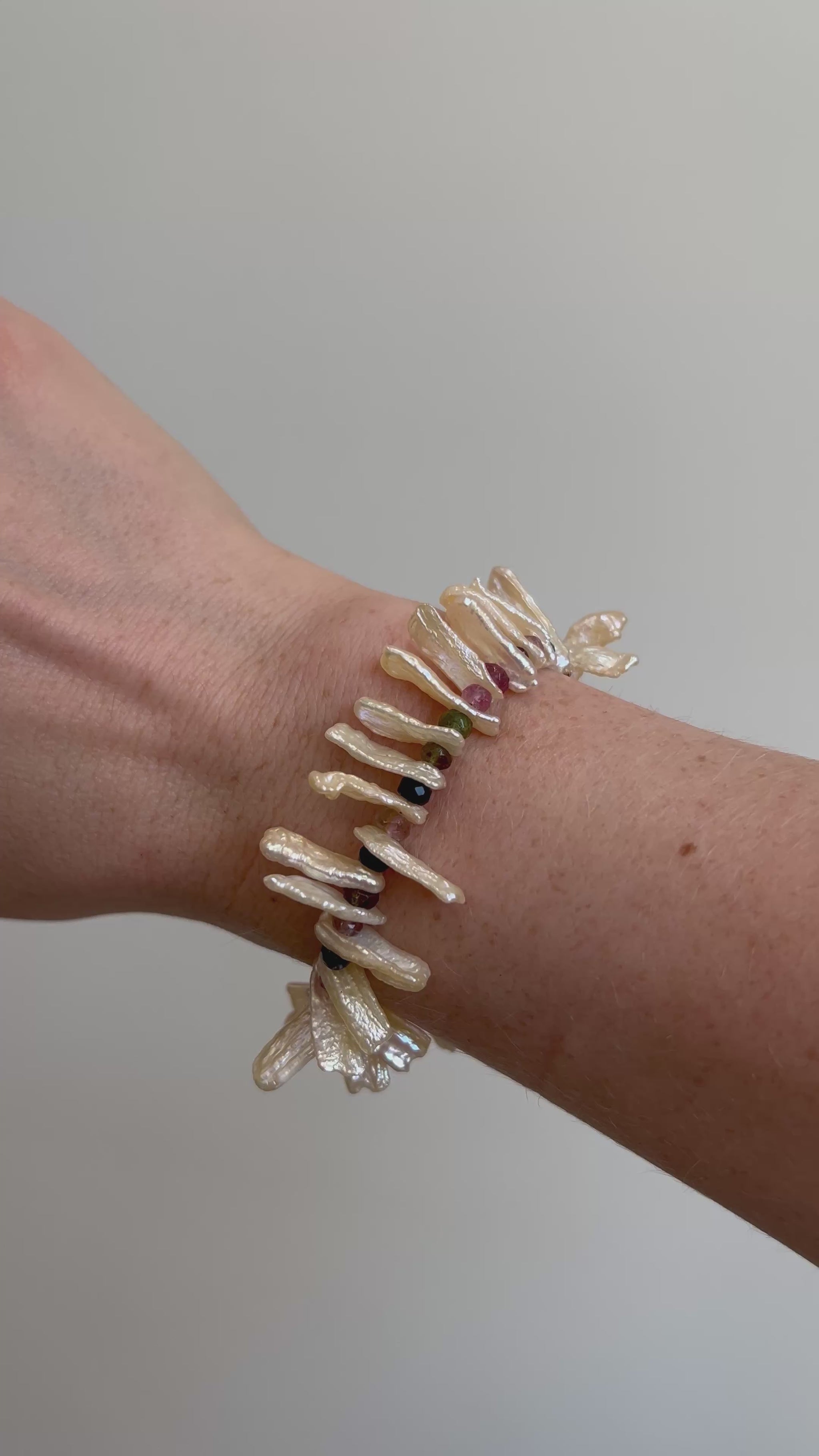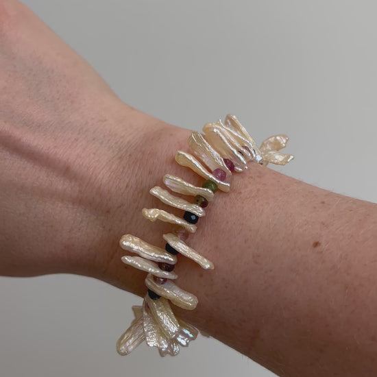 One-of-a-kind bracelet with a treasure trove of biwa stick pearls and watermelon tourmaline.
